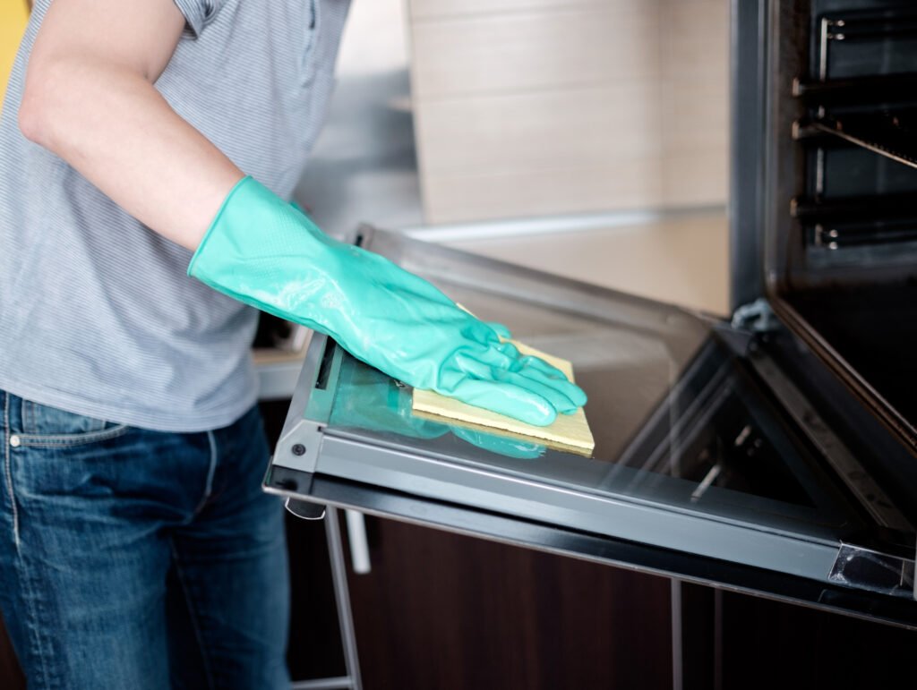 Man’s hand cleaning the kitchen oven